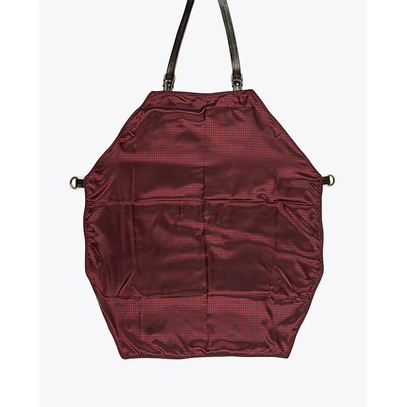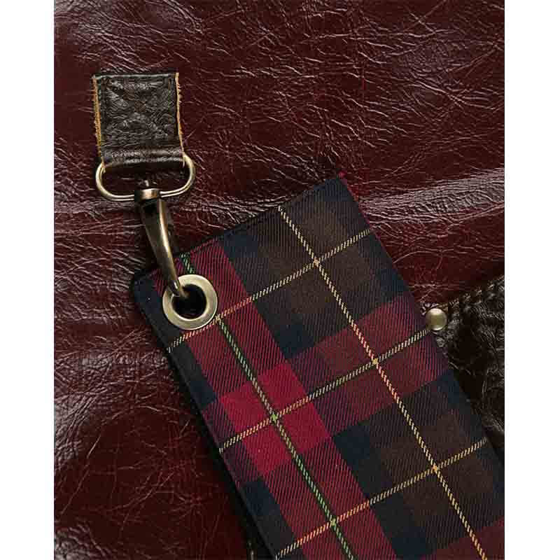 -雙層,外層勃根地紅全皮革+深咖啡皮革口袋,紅點內襯,上下雙口袋,側邊附有固定金屬環之訂製格紋棉布(此批為藍格紋)