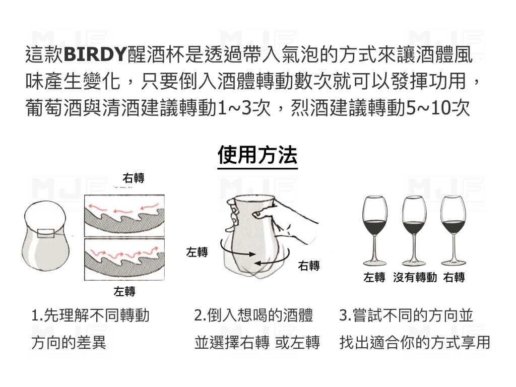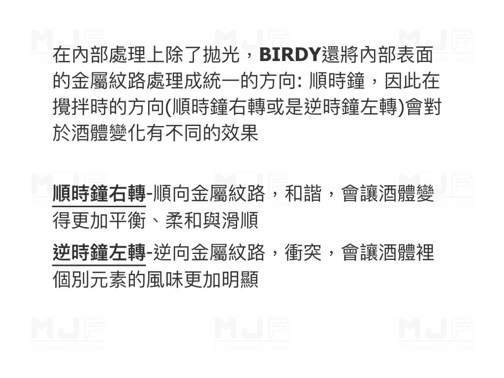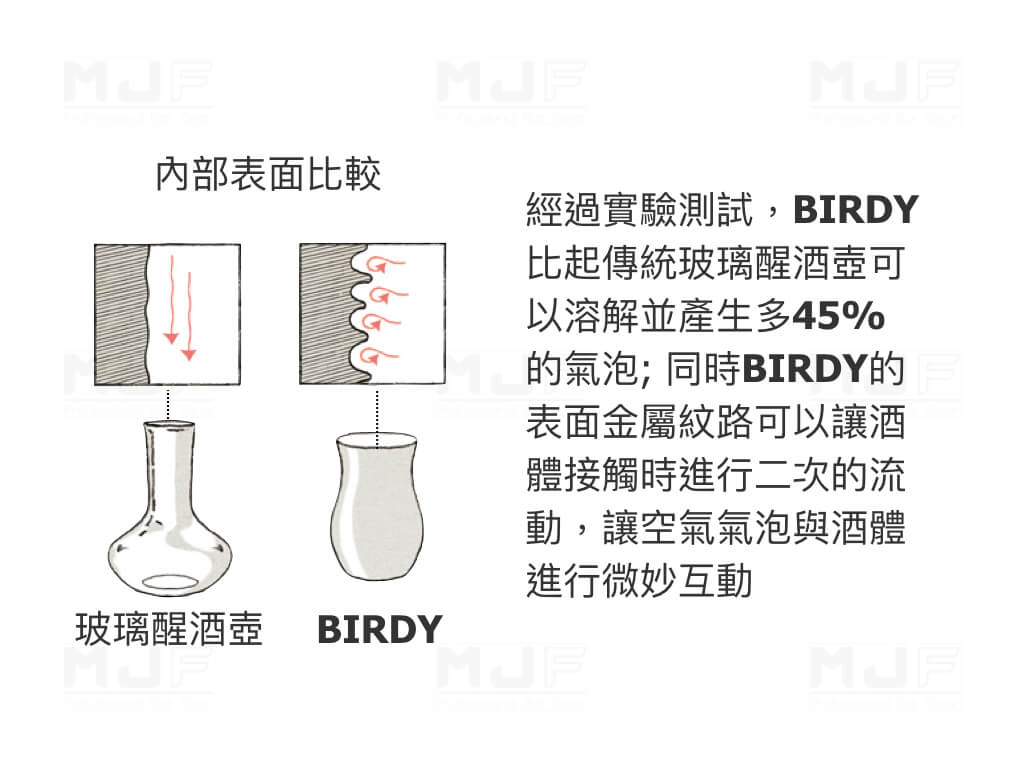 BIRDY使用日本職人等級的拋光工藝將這款醒酒杯內部表面處理成肉眼看不見的0.1微米等級,讓原本粗糙的表面變成細微的金屬高低紋路變化,透過與酒體的接觸產生氣泡,快速又溫柔的改變酒體風味,像是葡萄酒、威士忌、清酒與雞尾酒都可以使用